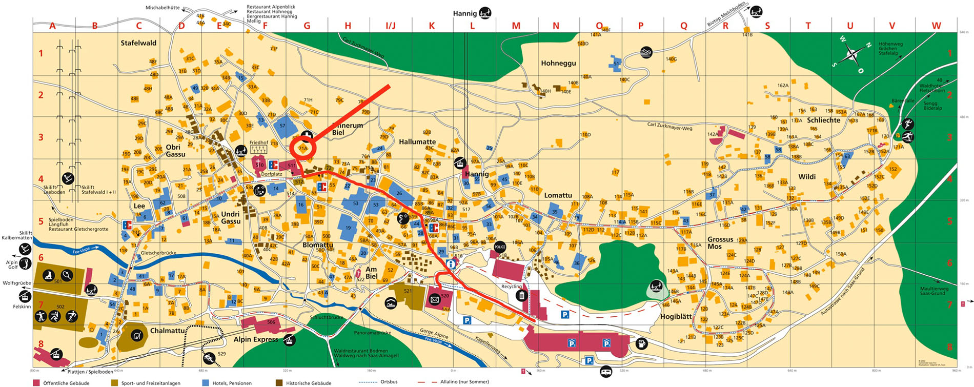 Nach Ihrer Ankunft beim Busterminal in Saas-Fee können Sie von dort aus ein Taxi anrufen oder Sie laufen zum Haus und leihen sich unseren Handwagen für den Transport Ihres Gepäcks aus.